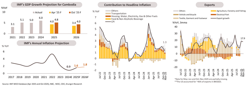 - Quỹ Tiền tệ Quốc tế (IMF) đã điều chỉnh dự báo tăng trưởng GDP của Campuchia năm 2025 lên 4,8% vào tháng 10 từ mức 4,0%, bất chấp những khó khăn từ bên ngoài do căng thẳng thương mại với Mỹ và tranh chấp biên giới với Thái Lan. Việc điều chỉnh tăng phản ánh xuất khẩu mạnh hơn dự kiến (+15,2% trong 10 tháng đầu năm 2025), dẫn đầu bởi hàng dệt may, giày dép và nông sản, cũng như dòng vốn FDI mạnh mẽ.