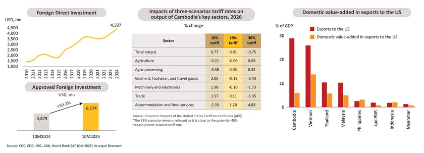 - FDI vẫn là động lực tăng trưởng bên ngoài mạnh mẽ. FDI được phê duyệt tăng 59% so với cùng kỳ năm trước trong 10 tháng đầu năm 2025, với Trung Quốc chiếm hơn một nửa tổng số. Phần lớn vốn tiếp tục chảy vào lĩnh vực công nghiệp, trong đó đáng chú ý là dự án kênh đào Funan Techo trị giá 1,2 tỷ USD. Mặc dù dòng vốn vào mạnh mẽ trong ngắn hạn, triển vọng vẫn đối mặt với rủi ro giảm sút ngày càng tăng, với các chính sách thương mại không chắc chắn, xung đột biên giới và các vấn đề lừa đảo ảnh hưởng đến tâm lý nhà đầu tư.