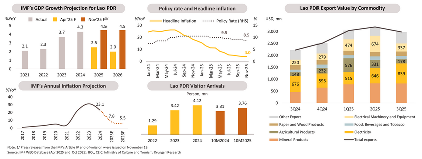 - IMF đã điều chỉnh tăng trưởng GDP lên 4,5% trong giai đoạn 2025-2026, chủ yếu nhờ nhu cầu bên ngoài mạnh mẽ. Xuất khẩu tăng tốc trong nửa đầu năm 2025, với điện và sản phẩm khoáng sản vẫn là những mặt hàng xuất khẩu chủ lực. Ngoài ra, xuất khẩu thiết bị điện và nông sản, đặc biệt là sang Trung Quốc, tăng mạnh do nhu cầu mạnh mẽ từ Trung Quốc và hệ thống logistics được cải thiện nhờ tuyến đường sắt cao tốc Lào-Trung Quốc. Tuy nhiên, xuất khẩu đã giảm tốc trong quý 3 năm 2025 khi thuế quan có đi có lại bắt đầu có hiệu lực. Du lịch là một động lực bên ngoài quan trọng khác, với lượng khách du lịch đến trong 10 tháng đầu năm 2025 tăng 13% so với cùng kỳ năm trước.
