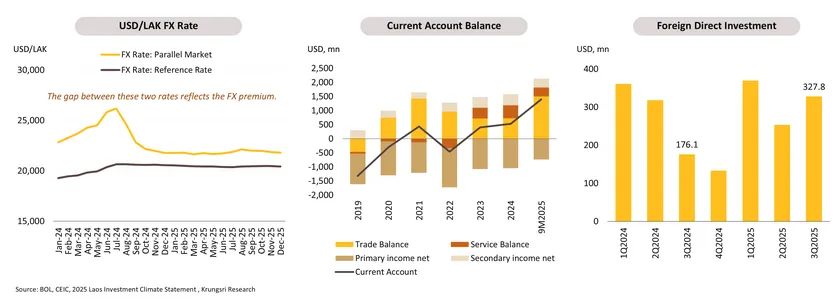 - Sự ổn định của đồng LAK đã được cải thiện đáng kể, với mức chênh lệch tỷ giá trung bình từ đầu năm đến nay (10 năm 2025) giảm xuống còn 6,8% từ mức 17,4% của năm trước. Điều này cho thấy tình trạng thiếu ngoại tệ đang được cải thiện, nhờ vào cán cân vãng lai mạnh hơn, dòng vốn FDI tăng và sự hỗ trợ chính sách liên tục. Cán cân vãng lai ghi nhận thặng dư thương mại và dịch vụ khả quan. Sự gia tăng FDI cũng thúc đẩy dòng vốn ngoại tệ, với tổng FDI trong 9 tháng đầu năm 2025 tăng 11,1% so với cùng kỳ năm trước, chủ yếu vào các dự án khai thác mỏ, cơ sở hạ tầng, xây dựng và thủy điện.