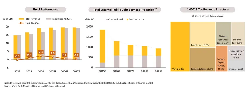 - Bên cạnh việc ổn định tiền tệ, tổng nợ công và nợ được nhà nước bảo lãnh (PPG) đã giảm – một bước phát triển quan trọng đối với sự ổn định tài chính. Các quan chức Lào thông báo vào ngày 10 tháng 11 rằng chính phủ đã giảm thành công nợ PPG xuống khoảng 88% GDP, giảm từ 112% vào năm 2021, sau các cuộc đàm phán về dịch vụ nợ, tái cấu trúc khoản vay và hạn chế các khoản vay mới không hiệu quả. Dự báo dịch vụ nợ công sẽ tiếp tục giảm trong suốt giai đoạn 2025-2029. Mặc dù các nỗ lực chính sách nhằm ổn định tiền tệ và cải thiện chính sách tài khóa thể hiện cam kết giải quyết sự bất ổn tài chính, nhưng tình trạng phụ thuộc vào nguồn vốn nước ngoài cao, nợ công gia tăng và tính minh bạch hạn chế trong việc tái cấu trúc khoản vay vẫn khiến quốc gia này dễ bị tổn thương trước các cú sốc từ bên ngoài.