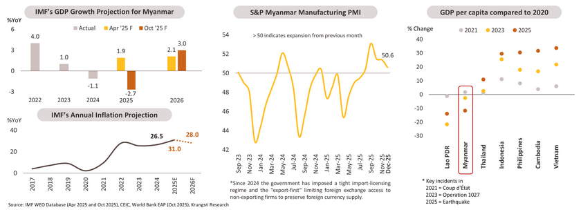 - Các xung đột nội bộ vẫn là gánh nặng mang tính cấu trúc đối với nền kinh tế, do sự gián đoạn chuỗi cung ứng từ cuộc đảo chính năm 2021, xung đột vũ trang sắc tộc leo thang và trận động đất gần đây—kết hợp với các lệnh trừng phạt và chính sách thương mại thắt chặt hơn*—đã làm tăng chi phí đầu vào, đẩy chi phí sinh hoạt lên cao và khiến GDP bình quân đầu người giảm xuống dưới mức trước đảo chính.