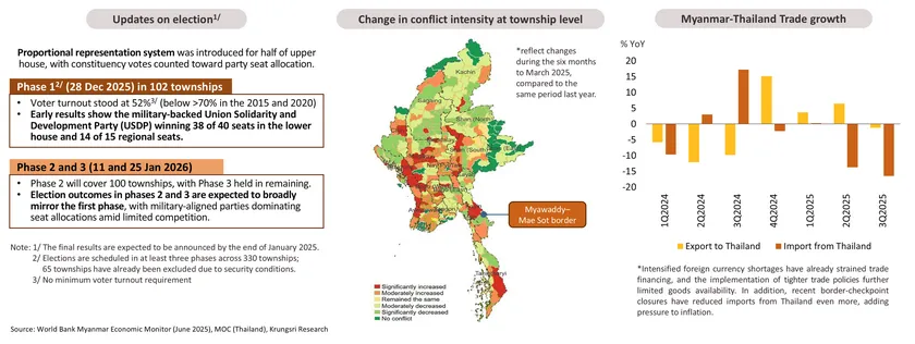 - Vì xung đột vũ trang sắc tộc dự kiến sẽ tiếp diễn, đặc biệt là ở các thị trấn biên giới tranh chấp nơi giao tranh leo thang trước cuộc bỏ phiếu, sự sụp đổ trong thương mại xuyên biên giới, sự gián đoạn hậu cần nội địa và khả năng tiếp cận thị trường hạn chế khó có thể được giải quyết. Hơn nữa, việc đóng cửa cửa khẩu biên giới Myawaddy-Mae Sot – kênh nhập khẩu có giá trị cao nhất của Myanmar từ Thái Lan – trong chiến dịch trấn áp của chính quyền quân sự đối với việc tài trợ thương mại bất hợp pháp cho các nhóm vũ trang sắc tộc đã làm căng thẳng thêm chuỗi cung ứng, gây thêm áp lực tăng lên đối với lạm phát.