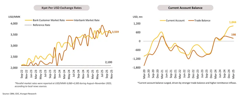 - Việc đồng Kyat tăng giá gần đây phản ánh sự can thiệp mạnh mẽ của ngân hàng trung ương và các biện pháp kiểm soát ngoại hối liên quan đến nhập khẩu nghiêm ngặt hơn, chứ không phải sức mạnh thực sự của thị trường. Theo chính sách ưu tiên xuất khẩu – yêu cầu chứng minh thu nhập xuất khẩu để tiếp cận ngoại tệ cho nhập khẩu – việc tiếp cận ngoại tệ thực tế bị hạn chế đối với các nhà xuất khẩu, khiến các nhà nhập khẩu phải đối mặt với tình trạng thiếu hụt nghiêm trọng nguyên liệu đầu vào và hàng hóa thành phẩm. Điều này làm cho đồng Kyat có vẻ mạnh hơn so với các yếu tố cơ bản và đã dẫn đến những gián đoạn đáng kể về hoạt động và tài chính đối với các doanh nghiệp giao dịch với Myanmar.