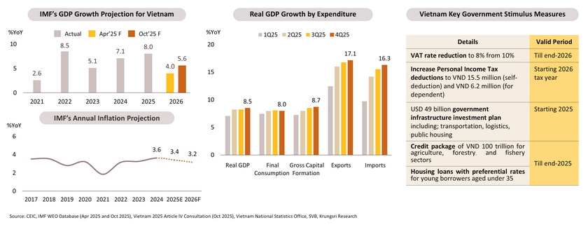 - Tăng trưởng GDP của Việt Nam năm 2025 đạt 8,0%, cao hơn nhiều so với dự báo 6,5% của IMF hồi tháng 10, đưa Việt Nam trở thành nền kinh tế tăng trưởng nhanh nhất khu vực. Kết quả GDP cao hơn dự kiến, được thúc đẩy bởi tăng trưởng xuất khẩu mạnh mẽ 17,1%. Nhu cầu nội địa cũng là động lực chính của tăng trưởng. Tiêu dùng tư nhân được hỗ trợ bởi lạm phát được kiểm soát và các biện pháp kích thích của chính phủ, trong khi đầu tư công vào cơ sở hạ tầng cũng thúc đẩy đầu tư tư nhân.