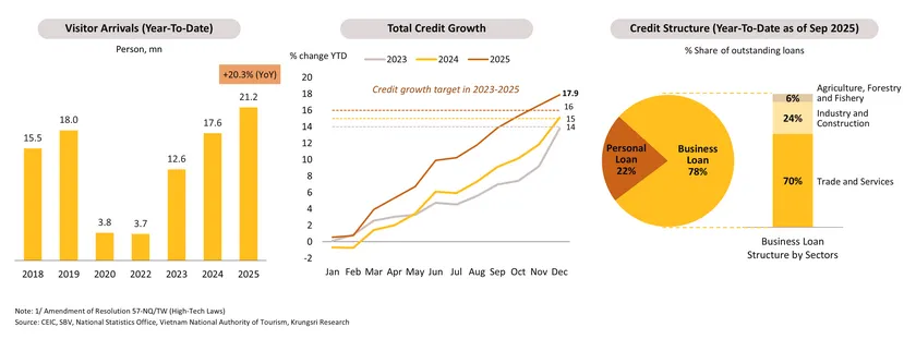 - Bên cạnh các động lực nội địa, tiêu dùng nội địa mạnh mẽ còn được hỗ trợ bởi sự bùng nổ của ngành du lịch. Lượng khách du lịch đến Việt Nam năm 2025 tăng 20,3% so với năm trước, vượt mức trước đại dịch COVID-19. Sự tăng trưởng liên tục của ngành du lịch đã giúp thúc đẩy doanh số bán lẻ liên quan đến du lịch, củng cố hoạt động kinh tế nội địa. Dự kiến ngành du lịch sẽ tiếp tục mở rộng trong năm 2026.