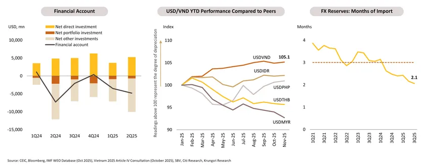 - Vấn đề ổn định tài chính của Việt Nam hiện đang tập trung vào lĩnh vực ngoại thương, với đồng VND giảm khoảng -5% (tháng 1-11 năm 2025), là đồng tiền yếu nhất trong khu vực. Dòng vốn FDI ròng và thương mại vào mạnh mẽ đã bị bù đắp bởi dòng vốn tài chính chảy ra liên tục, đặc biệt là việc trả nợ nước ngoài, dẫn đến dự trữ ngoại hối cạn kiệt và đồng VND mất giá. Hiện tại, dự trữ ngoại hối chỉ đủ đáp ứng 2,1 tháng nhập khẩu tính đến quý 3 năm 2025, hạn chế dư địa cho việc nới lỏng chính sách.