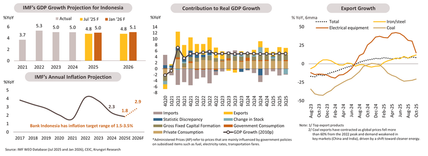 - Lạm phát sẽ tăng nhẹ vào năm 2026, chủ yếu do giá thực phẩm biến động và điều chỉnh giá do chính phủ thực hiện*, mặc dù dự kiến sẽ vẫn được kiểm soát tốt trong phạm vi mục tiêu. Do đó, cùng với rủi ro về sự suy giảm niềm tin và sự chậm trễ trong việc thực thi chính sách, chúng tôi dự đoán Ngân hàng Trung ương Indonesia (BI) sẽ thực hiện thêm các biện pháp nới lỏng tiền tệ.