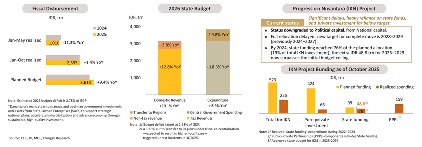 - Trong nước, tình trạng bất ổn chính trị kể từ đầu năm 2025 – do phản ứng dữ dội về việc cắt giảm ngân sách phúc lợi và tăng phụ cấp cho các nhà lập pháp – đã làm trì hoãn chi tiêu công và làm gia tăng lo ngại về việc thực thi chính sách, góp phần tạo ra môi trường đầu tư thận trọng. Điều này được phản ánh trong tăng trưởng đầu tư công yếu trong quý 1 năm 2025 trước khi hoạt động phục hồi trong quý 2-3 năm 2025. Nhìn về phía trước, tín hiệu của chính phủ về việc tăng cường đầu tư thông qua quỹ tài sản quốc gia Danantara* cũng sẽ giúp thu hút đầu tư tư nhân.