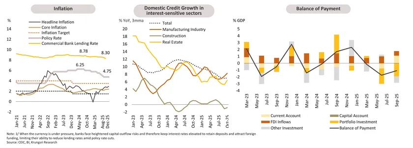 - Lãi suất chính sách ở mức 4,75% trong tháng 11 năm 2025 sau khi Ngân hàng Trung ương Indonesia (BI) cắt giảm tổng cộng 150 điểm cơ bản kể từ tháng 9 năm 2025. Chu kỳ nới lỏng dự kiến sẽ tiếp tục dần dần trong năm 2026, với dư địa đủ lớn cho những đợt giảm lãi suất tiếp theo được hỗ trợ bởi lạm phát trong tầm mục tiêu. Tuy nhiên, những lo ngại ngày càng tăng về uy tín của chính phủ và sự ổn định chính trị, cùng với những câu hỏi về tính độc lập của BI và quỹ đạo cắt giảm lãi suất của Cục Dự trữ Liên bang Mỹ (Fed), có thể hạn chế tốc độ và phạm vi nới lỏng tiền tệ. Đồng rupiah đã mất giá gần 4% từ đầu năm 2025 (xem trang 21), do tình trạng bất ổn và niềm tin suy yếu đã gây ra dòng vốn đầu tư nước ngoài chảy ra và làm tăng biến động tỷ giá hối đoái, làm nổi bật những lo ngại về nhiệm vụ ổn định bên ngoài của BI.