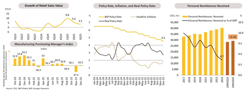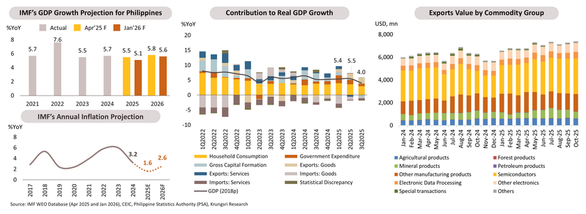 - Năm 2026, nền kinh tế Philippines dự kiến sẽ tăng trưởng 5,6%, được hỗ trợ bởi tiêu dùng mạnh mẽ hơn trong bối cảnh điều kiện tài chính được nới lỏng và kiều hối dồi dào, cùng với đầu tư tư nhân vào các ngành công nghiệp trọng điểm của chính phủ như năng lượng tái tạo và chất bán dẫn. Chất bán dẫn vẫn là một lĩnh vực xuất khẩu chủ chốt trong bối cảnh nguồn cung toàn cầu đang khan hiếm và nhu cầu ổn định. Mặc dù sự suy yếu trong chi tiêu công do kiểm soát tham nhũng chặt chẽ hơn sẽ ảnh hưởng đến hoạt động kinh tế trong nước, nhưng việc nới lỏng tiền tệ sẽ giúp giảm bớt phần nào áp lực này.