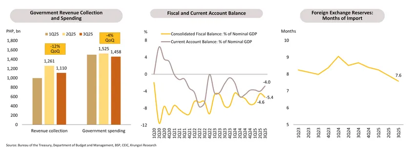 - Không gian tài chính của đất nước bị hạn chế. Thu ngân sách và chi tiêu của chính phủ tăng chậm trong quý 3 năm 2025. Thêm vào đó, còn nhiều thách thức hơn trong chi tiêu ngân sách năm tới, do ba yếu tố chính: i) Các cuộc điều tra tham nhũng liên quan đến kiểm soát lũ lụt có thể làm gián đoạn việc giải ngân ngân sách, ii) Phân bổ lại ngân sách, chuyển hướng từ sáng kiến cơ sở hạ tầng trọng điểm “Xây dựng tốt hơn, nhiều hơn” của Tổng thống Marcos Jr. để bù đắp thiệt hại do thiên tai và kích thích kinh tế, và iii) Kế hoạch củng cố tài chính đang được tiến hành nhằm giảm thâm hụt xuống 4,3% GDP vào năm 2028 từ mức dự kiến 5,5% vào năm 2025, hạn chế không gian tài chính.