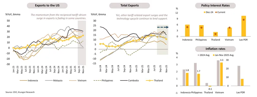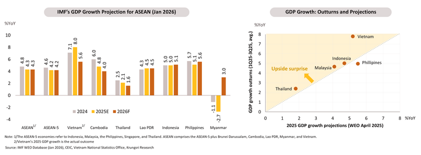 - Tăng trưởng của ASEAN-5 được dự báo đạt 4,2% vào năm 2026, ổn định so với mức 4,2% năm 2025, được hỗ trợ bởi chu kỳ phát triển công nghệ, góp phần duy trì đà xuất khẩu, cùng với các biện pháp kích thích tài chính và tiền tệ trước đó. Lạm phát thấp hơn cũng sẽ duy trì hoạt động kinh tế trong nước. So với dự báo tăng trưởng của IMF hồi tháng 4, kết quả GDP thực tế đến hết quý 3 năm 2025 mạnh hơn dự kiến nhờ thuế quan đối ứng của Mỹ thấp hơn so với giả định và xuất khẩu tăng mạnh hơn.