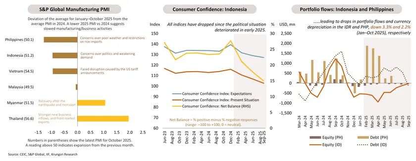 - Về các yếu tố đặc thù của từng quốc gia, sự bất ổn chính trị dai dẳng vẫn là một thách thức trong khu vực, làm giảm niềm tin và trì hoãn việc thực thi chính sách. Tại Philippines, các vụ bê bối tham nhũng đã làm gián đoạn chi tiêu công và đầu tư, thể hiện qua sự suy giảm mạnh GDP trong quý 3 năm 2025. Tại Indonesia, các cuộc biểu tình trước đó, những lo ngại về sự ổn định tài chính và tính độc lập của ngân hàng trung ương đã hạn chế phân bổ ngân sách và làm suy yếu tâm lý nhà đầu tư.