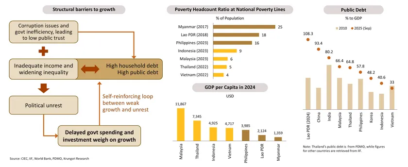 Những thách thức về cấu trúc tiếp tục tạo ra áp lực theo chu kỳ, tạo nên một vòng luẩn quẩn tự củng cố, hạn chế tiềm năng tăng trưởng của ASEAN. Tại các quốc gia có khả năng tiếp cận tài chính cao hơn, như Thái Lan, nợ hộ gia đình cao vẫn là một trở ngại chính đối với hoạt động kinh tế trong nước. Ngược lại, các nền kinh tế có mức độ tiếp cận tài chính thấp – như gần đây ở Indonesia và Philippines – phải đối mặt với những điểm yếu về thể chế dai dẳng và bất bình đẳng ngày càng gia tăng, thường dẫn đến bất ổn chính trị. Ngoại trừ Việt Nam, hầu hết các quốc gia trong khu vực cũng phải đối mặt với nợ công cao hoặc không gian tài chính hạn chế. Nếu những nút thắt cấu trúc này không được giải quyết, chúng sẽ tiếp tục làm trầm trọng thêm những điểm yếu về kinh tế và xã hội, hạn chế tăng trưởng trên toàn khu vực.