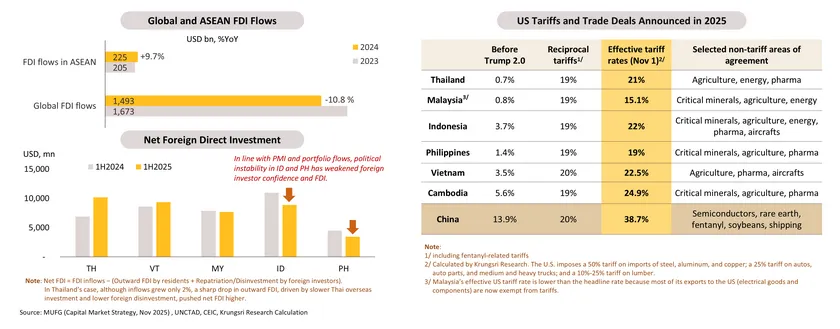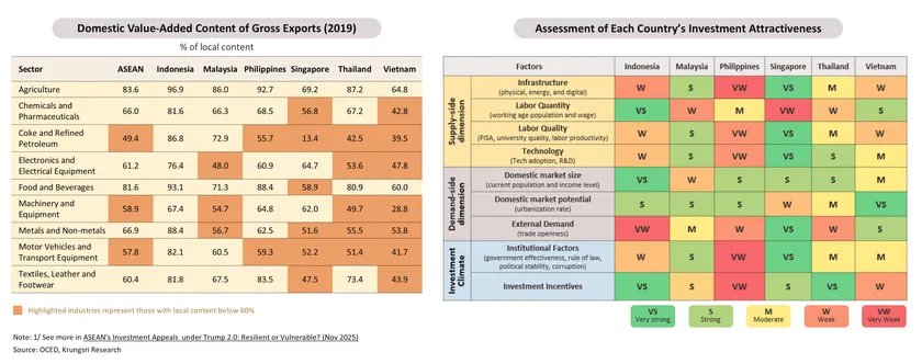 - Trong trung hạn, FDI sẽ vẫn là động lực tăng trưởng của khu vực, mặc dù thuế quan gia tăng của Mỹ và các quy định về tỷ lệ nội địa hóa nghiêm ngặt hơn có thể thách thức khả năng cạnh tranh về chi phí của ASEAN. Bên cạnh chi phí, các yếu tố chất lượng, chẳng hạn như cơ sở hạ tầng, lao động lành nghề và chiều sâu chuỗi cung ứng, sẽ đóng vai trò quan trọng trong việc tăng cường khả năng phục hồi trước những bất ổn về thương mại và đầu tư.